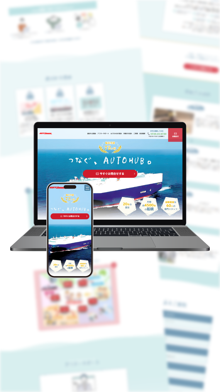 工夫:船の写真を大胆に使用し、事業内容を一目で伝えるデザイン。数字の実績を掲載し信頼を獲得。海の青系の配色、波シェイプでスクロール=船で目的(お問い合わせ)へ近づく。